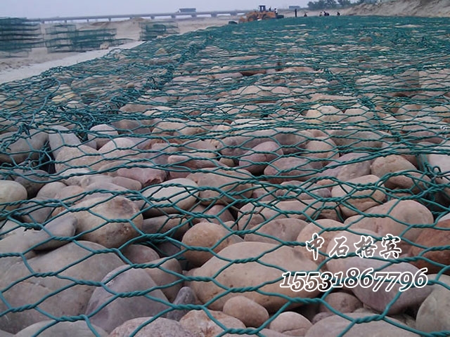 護腳固濱石籠中裝入塊石,塊石較大而平的一面擺在籠子周圍,使固濱石籠四周平直。避免出現凸凹現象。中間用顆料較小的石塊填塞緊密,固濱石籠四周石料不能小于網孔尺寸。固濱石籠較上一層石塊擺放時,應大面朝上。保證固濱石籠的平整,較后封閉格賓石籠。固濱石籠之間用綁扎線進行連接,形成一個更穩固的整體。